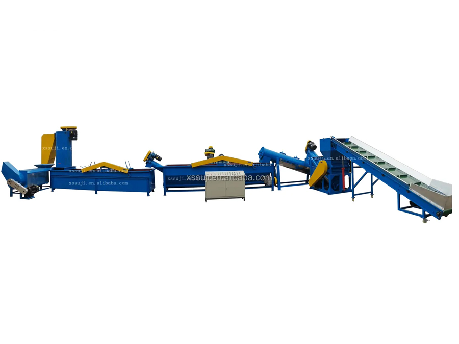 本機(jī)組配備了加重款破碎機(jī),適用于噸包袋、編織袋等偏硬塑料破碎清洗。一步漂洗槽采用螺旋底推水槽,便于淤泥等雜質(zhì)的排出,經(jīng)過(guò)二步水槽的再次清洗,塑料的潔凈度達(dá)到更高。